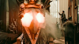 Carriere, writing decades after Cocteau’s death, continues the religious incantation while describing cinema. “For the duration of the film, it briefly isolates a group of people from the rest of the world. As if, escaping life’s turbulence for the space of two hours, the audience could forget time, could stop growing old. The modern cave shelters us from the oldest of evils.” Art, and most especially the Promethean light-capturer Cinema, is the defiant stance against Death, “death” being defined by Andre Bazin as “the victory of time.” Hugo is replete with statues, from the funerary figures leading to Melies’ apartment to the bishop’s tomb locked away in the museum attic, where Hugo’s father ponders the revolutions of globes. The automaton is another statue, and the filmmakers designed about a dozen separate automatons, slightly changing the visage of the figure from scene to scene, the final automaton – the last image of the picture – having a faint Mona Lisa smile (Leonardo DaVinci being an important artist who helped introduce a realistic sense of perspective into painting, much like 3D cinematography, where iconic figures who transcended reality were now human beings duplicating reality spatially). The statues in Hugo are premonitions of Death, though Bazin notes that “the primordial function” of the statuary art is “a preservation of life by a representation of life.” The statue is a preservation from a second, “spiritual death. A spiritual reality where symbol transcends models.” Among the more recent adult fairy tales Hugo resembles, it's fair to include Terry Gilliam's The Adventures of Baron Munchausen, a fantasy blending the illusion of performance and grim present reality of a desperate situation, shadows broken, looming, and resurrected to embolden poor individuals. Art represents the artist saying “I Am” and “I Was” (like Jude Law’s Gigolo Joe says in Spielberg’s AI), or Christ conquering death through resurrection in Last Temptation, whose death may be Scorsese’s previous “happy ending” before Hugo (one could make a similar argument, though, for Kundun and Bringing Out the Dead).